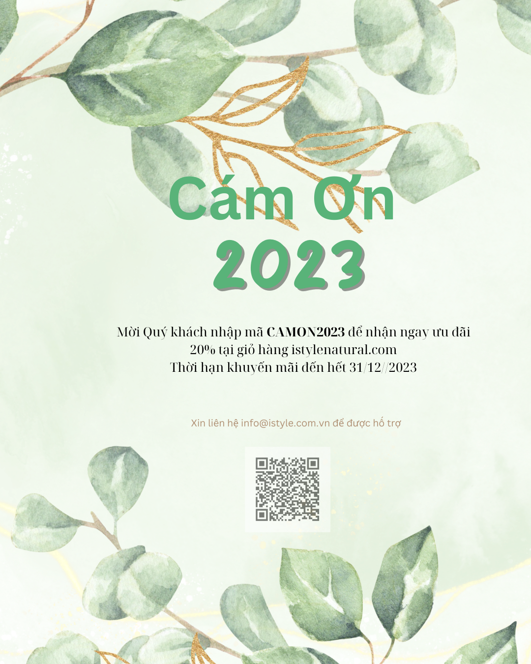 Để bày tỏ lòng biết ơn một cách cụ thể, chúng tôi vô cùng phấn khích khi mang đến chương trình khuyến mãi đặc biệt CAMON2023 với ưu đãi trên tất cả các sản phẩm cho đến khi chuông báo năm mới 2024 gọi tới. Đây là cách chúng tôi muốn nói lời cảm ơn vì Quý khách đã trở thành một phần quan trọng của gia đình Istylenatural.com. Xin quý khách nhập mã CAMON2023 tại giỏ hàng istylenatural.com và nhận ngay ưu đãi!