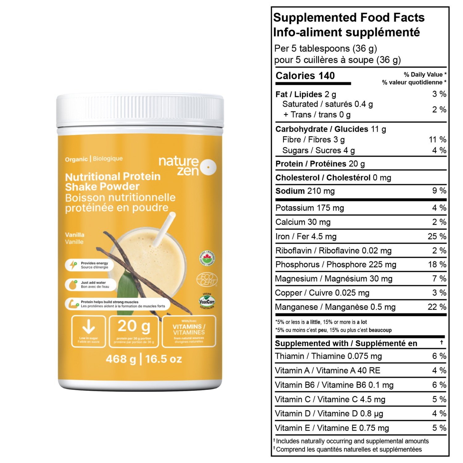 Thành phần : Đạm đậu, đạm mầm gạo lứt, bột vani, hỗn hợp bột trái cây và rau củ (Táo, cải xoăn, bông cải xanh, rau bina, cà rốt, mùi tây, củ cải đỏ, bắp cải xanh, việt quất, dâu rừng, dâu tây, cà chua), chất ổn định : Pectin (ÍN 440), mầm đậu vàng, bột gạo, dầu hướng dương, hương tự nhiên, muôi hồng Himalyan, cỏ ngọt hữu cơ.